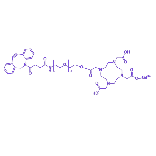 DBCO-PEG-DOTA-Gd 是一种整合点击化学靶向、生物相容性增强及MRI 成像功能的多功能生物医学分子,由 DBCO 基团、PEG 链段、DOTA 螯合剂与钆离子协同构成,在生物偶联及分子影像领域具有重要应用价值。 其核心结构单元特性如下:DBCO 基团通过独特双环结构实现高效点击化学反应,在温和条件下可与叠氮基团快速形成稳定共价键,为生物分子的精准偶联提供可靠化学工具;PEG 链段凭借重复单元的亲水性提升分子水溶性,同时通过柔性链结构降低免疫原性、增强生物相容性,减少非特异性结合并维持复杂生物环境中的结构稳定性;DOTA 螯合剂利用多配位位点与钆离子形成高稳定性复合物,该DOTA-Gd 单元可通过改变周围水分子弛豫特性显著增强 MRI 成像对比度,为病变组织的精准识别及疾病诊断提供关键技术支持。