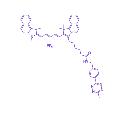 CY5.5作为近红外菁染料,发射波长约690 nm,具备深层组织穿透能力(穿透深度达数毫米)及低生物自发荧光干扰特性,适用于深层生物成像需求。分子结构中的四嗪基团可与反式环辛烯(TCO)发生无铜点击化学反应,该反应无需催化剂,在生理pH及室温条件下即可快速进行,可在活生物体系中实现精准标记。