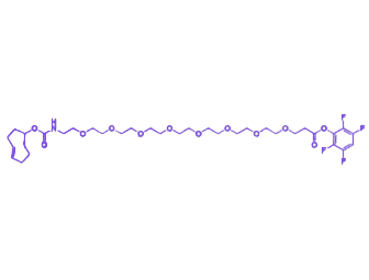 TCO-PEG8-TFP ester 是一种兼具 长效生物正交偶联氨基反应 双功能的化学试剂,其分子结构以 TCO-PEG8-TFP ester 为核心,通过反式环辛烯(TCO)基团、TFP 酯(三氟苯酯)基团及聚乙二醇8(PEG8)链段的协同作用,满足生物分子修饰中高效偶联、长效靶向及生物相容性提升的综合需求。
