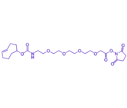 核心功能基团 反式环辛烯(TCO) 可与四嗪(Tetrazine)类化合物在无催化剂、生理条件下发生快速高效的生物正交反应,具备高选择性与高反应速率,能够满足活体成像、深层组织靶向修饰等对反应条件要求严苛的应用场景。分子结构中引入的 聚乙二醇4(PEG4) 链段,相较于 shorter PEG 链(如 PEG3)显著提升了整体亲水性,有效降低免疫原性与非特异性吸附,同时延长偶联产物在体内的循环半衰期。独特设计的 亚甲基(CH2)连接臂 增强了分子柔性,缓解了 PEG 链与 NHS 酯基团间的空间位阻效应,提升了对抗体、酶等生物大分子活性位点的适配性,最大程度减少偶联过程对生物功能的干扰。末端活化基团 N-羟基琥珀酰亚胺酯(NHS ester) 具有高反应活性,在 pH 7.0-8.5 的生理兼容条件下,可与蛋白质赖氨酸残基、多肽氨基端等含游离氨基的生物分子高效反应,形成稳定的酰胺键,实现定向偶联。该试剂在抗体-药物偶联物(ADC)的长效修饰、活体靶向探针的制备以及生物支架表面功能化等领域展现出重要应用价值。
