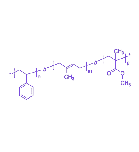 该共聚物的核心性能源于各嵌段的协同作用:PS 段凭借刚性芳香族结构提供形态稳定性和相分离驱动力,确保材料在加工与使用过程中的结构完整性;PI 段作为中间柔性链段,赋予材料高柔韧性与可逆变形能力,同时可通过调节链段长度与分子量比例调控各相界面张力,进而影响微相结构的形貌演化;PMMA 段则以其高玻璃化转变温度(Tg) 和极性结构提升体系的结构规整度与耐溶剂性,并通过末端极性基团促进与无机粒子的界面相容性。