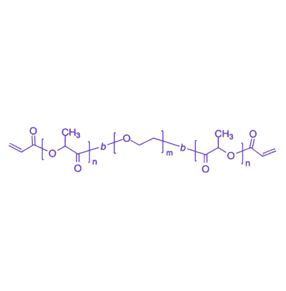 主链 PLA-PEO-PLA 中,PLA 为疏水性端链,PEO 为亲水柔性中段,形成亲水-疏水协同结构;两端 Acryl 端基可通过光引发剂、热引发剂或自由基引发交联反应,形成高强度三维网络结构。相较于普通 PLA-PEO-PLA,该材料在构建水凝胶或涂层时具有更高的稳定性与可调控机械性能,可避免自组装结构在体液中被快速解离。