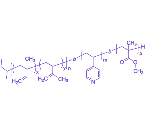 P(1,2I-co-3,4I)-b-P4VP-b-PMMA是一种ABC型三嵌段共聚物,通过活性聚合精确调控各嵌段长度与共聚组成,分子量分布系数(PDI)通常小于1.35。该材料集成可功能化弹性体、智能响应聚合物和结构塑料特性,通过微相分离形成复杂多级纳米结构,可经多步化学修饰实现界面与本体性质的精准调控,在高级纳米图案化、智能涂层及多功能纳米复合材料领域展现显著应用潜力。