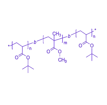 Poly(tert-butyl acrylate)-b-poly(methyl methacrylate)-b-poly(tert-butyl acrylate) (PtBA-b-PMMA-b-PtBA)是一种结构对称的ABA型三嵌段共聚物,通过分子设计将可化学转化的丙烯酸酯聚合物与刚性丙烯酸酯聚合物结合,形成"可转化-刚性-可转化"的三明治结构。该材料以聚(甲基丙烯酸甲酯)(PMMA)为中间嵌段,两侧对称连接聚(丙烯酸叔丁酯)(PtBA)嵌段,兼具结构可控性、化学可修饰性和自组装特性,在先进功能材料领域具有重要应用潜力。