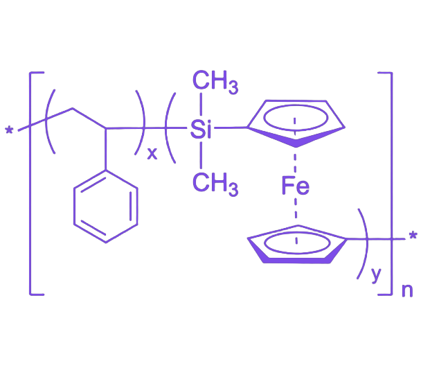 Poly(styrene-co-ferrocenyl dimethylsilane) 无规共聚物是一种通过苯乙烯单体与二茂铁硅烷单体无规共聚形成的先进功能材料,集成了聚合物优良加工性能与茂金属丰富功能性,通过调控二茂铁硅烷单体含量可实现对材料氧化还原电位、电导率、自组装行为及最终功能的准确定制。 该共聚物的设计核心在于苯乙烯(St)单元与二茂铁基二甲基硅烷(FcSi)单元的协同作用。苯乙烯单元构成聚合物主体骨架,为材料提供成膜性、力学强度和热塑性加工能力;二茂铁硅烷单元则是赋予材料智能响应与特异功能的关键,其侧链含有的具有夹心结构的二茂铁基团,核心铁原子可发生可逆的Fe²⁺/Fe³⁺氧化还原反应,使共聚物具备电化学活性并伴随明显颜色变化。 氧化还原活性与聚合物特性的结合为该材料开辟了多领域应用前景。在传感与检测技术领域,可用于构建电化学传感器,通过电流响应或颜色变化检测特定氧化还原活性物质或环境变化;在数据存储与分子电子学中,二茂铁单元可作为分子级电荷存储位点,通过控制氧化还原状态实现信息写入与读取;在催化科学中,可用作可回收的非均相催化剂或催化剂载体;在自组装与纳米技术中,嵌段共聚物形态下能形成有序纳米结构,二茂铁链段可作为反应性模板,通过选择性刻蚀或转化制备纳米多孔材料或无机纳米图案;此外,其氧化状态依赖的亲疏水性变化可用于构建智能响应表面。