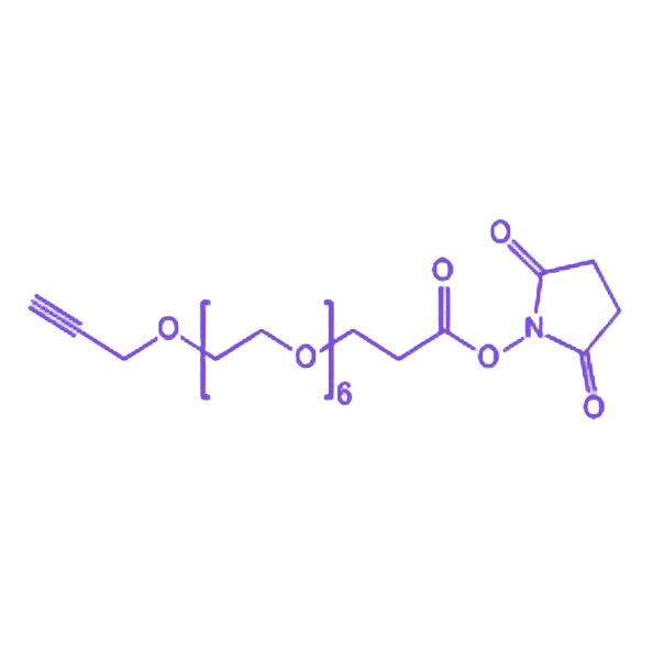 Alkyne-PEG7-NHS 是一种 双功能交联试剂,由炔基(Alkyne)端基、七聚乙二醇(PEG7)链段及 N-羟基琥珀酰亚胺酯(NHS ester)构成,兼具高效偶联性能与良好生物相容性,广泛应用于生物分子修饰、药物偶联、分子探针构建及纳米载体功能化,是准确医疗和生物诊疗平台开发的关键工具。 分子结构中,NHS 酯基团可在 pH 7.0–8.5 缓冲液条件下快速与胺基反应,形成稳定酰胺键,反应无需催化剂且条件温和,尤其适用于蛋白质、抗体、多肽等结构敏感生物分子的修饰,能有效避免天然构象与功能活性的破坏。炔基(Alkyne)端基为后续 点击化学(Click Chemistry)提供特异性反应位点,可与叠氮化合物在温和条件下高效反应生成稳定三唑环结构,该反应具有专一性高、副产物少的特点,适用于分子影像探针、智能诊疗纳米载体及药物递送体系的构建。PEG7 链段的引入显著提升了分子柔性与亲水性,减少立体位阻效应,增强水溶性及产物在体内外体系的分散性与稳定性;相较于短链 PEG 修饰剂,PEG7 在药物长循环、低免疫原性及高修饰密度方面更具优势,确保其在复杂生物环境中展现优异性能。 该试剂整合了高效偶联、低免疫原性及良好生物相容性三大核心特性,在分子诊疗、智能纳米药物平台及生物功能材料的研发领域具有不可替代的应用价值。