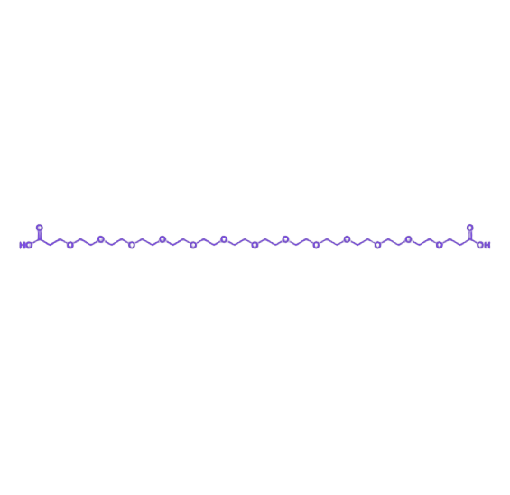 其核心优势源于超长 PEG 链与双羧基的协同作用:羧基经 EDC/NHS 活化后可高效偶联氨基、羟基,实现分子双位点准确修饰;十三乙二醇链能形成更厚的“隐形层”,减少蛋白聚集、酶解及单核巨噬细胞吞噬,大幅提升修饰产物的稳定性;无响应性醚键连接使其适合需长期体内稳定的应用场景。