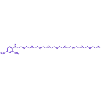 2,4-二硝基苯胺(DNP)作为末端修饰基团,具有强吸电子特性,这一特性使其在生物分子标记实验中能够稳定结合靶标分子,同时在荧光猝灭研究中可通过能量转移机制有效调控荧光信号,为生物检测和成像提供精确的信号控制手段。由9个乙二醇单元组成的PEG9链,赋予该化合物良好的水溶性和生物相容性,能够显著降低在生物体系中与非目标生物分子的非特异性结合,提高实验的特异性和准确性,同时其柔性链结构有助于维持修饰后生物分子的天然构象和生物活性。叠氮基团(-N₃)位于PEG链的另一端,作为高反应性官能团,可通过铜催化的叠氮-炔环加成反应(CuAAC)等点击化学反应,与含有炔基的化合物发生高效、高选择性的共价连接,为生物分子的定点修饰和偶联提供可靠的化学工具。
