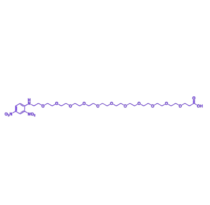 DNP-PEG11-COOH 是一种整合了发色基团、超长亲水链与羧酸反应端的多功能分子,其独特结构赋予了优异的水溶性、光谱可追踪性和化学反应活性,适用于构建复杂功能连接子及分子探针。 分子结构由三个关键功能单元构成:一端为 2,4-二硝基苯基(DNP),作为具有紫外吸收特性的发色团,可作为光谱探针使用,并具备光敏或化学还原转化潜力;中间段为 聚乙二醇11(PEG11)链段,由十一个乙二醇单元组成,形成超长亲水间隔臂,显著提升分子水溶性、柔顺性及在极性介质中的分散行为,同时有效实现DNP基团与羧酸基团的空间分隔;另一端为 羧酸基团,作为通用反应位点,经活化后可与胺类化合物形成酰胺键,或参与其他羧酸衍生化反应。 该化合物凭借极长亲水链带来的生物相容性、DNP基团的光学可检测特性及羧酸基团的反应多样性,在生物偶联化学、分子探针设计及水相体系功能化修饰中具有广泛应用前景,可用于合成带超长亲水臂的异质双功能连接子,研究超长距离分子内相互作用,以及在水相体系中引入可光谱追踪且可进一步共价固定的高度亲水性功能单元。