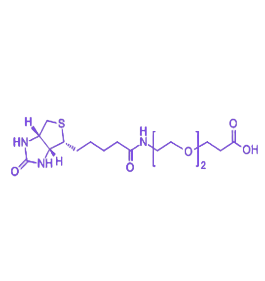 Biotin-PEG2-COOH 是一种双功能聚乙二醇衍生物,由生物素(Biotin)端基、羧基(–COOH)端基及中间的两个乙二醇单元(PEG2)构成,兼具生物素-亲和素体系的高特异性结合能力与羧基介导的稳定偶联反应特性,是生物化学与纳米生物技术研究中重要的连接分子。