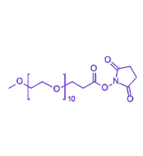 mPEG10-SPA(甲氧基聚乙二醇 10 琥珀酰亚胺丙酸酯)是一类具有明确分子结构与高生物活性的聚乙二醇衍生物,其通过精准的化学设计实现了结构稳定性与功能靶向性的有机统一,在生物医学及材料科学领域展现出重要应用价值。该分子由三部分核心结构单元构成:一端为化学惰性的甲氧基(-OCH₃),可有效抑制储存及反应过程中的非特异性副反应,保障分子结构完整性;中间链段由10个乙二醇单元有序连接形成亲水性PEG骨架,赋予分子优异的溶解性能,不仅可完全溶于水,还能在DMSO、DMF、乙腈等极性有机溶剂中实现均匀分散;另一端修饰的琥珀酰亚胺丙酸酯(SPA)基团为关键活性位点,具备与含氨基生物大分子(如蛋白质、多肽)发生特异性共价偶联的能力,通过酰胺键形成稳定连接。 基于上述结构特性,mPEG10-SPA可作为高效的生物分子修饰工具,通过SPA基团与生物大分子表面氨基的靶向反应实现PEG化修饰。该修饰过程能够显著提升生物分子的理化稳定性与体内循环半衰期,同时降低其免疫原性,并最大程度保留原有生物活性。此类特性使其在创新药物剂型开发中可改善药物代谢动力学性能,在生物成像技术中助力探针分子的精准定位,在细胞培养体系中优化生物活性因子的作用效率,为相关领域的基础研究与应用开发提供了重要的物质基础与技术支撑。