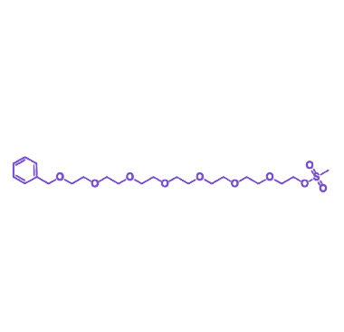 分子结构由三部分构成:苄基保护端提供稳定的疏水保护,可通过催化氢化选择性脱除;中间为聚乙二醇7(PEG7)链段,包含七个乙二醇单元,作为亲水性间隔基,能显著提升分子水溶性、柔顺性并提供空间位阻屏蔽效应;末端为甲磺酸酯基团(-OMs),作为高反应活性的亲电试剂和离去基团,可在温和碱性条件下与胺、醇、硫醇等亲核试剂发生S_N2亲核取代反应。