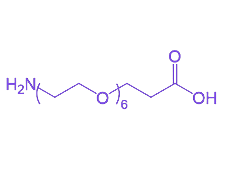 分子结构与理化特性:分子主链由6个乙二醇单元组成(-O-CH2-CH2-重复单元),两端分别共价连接氨基和羧基官能团。聚乙二醇链段赋予分子高水溶性和空间位阻效应,使其在水溶液中保持良好分散性,同时能有效减少修饰物的蛋白质非特异性吸附及细胞识别。该产品在常温干燥条件下化学性质稳定,但在高温(>60℃)、高湿(相对湿度>80%)或极端pH环境(pH<3或pH>10)下可能引发官能团水解或交联反应,建议储存于-20℃真空干燥环境。