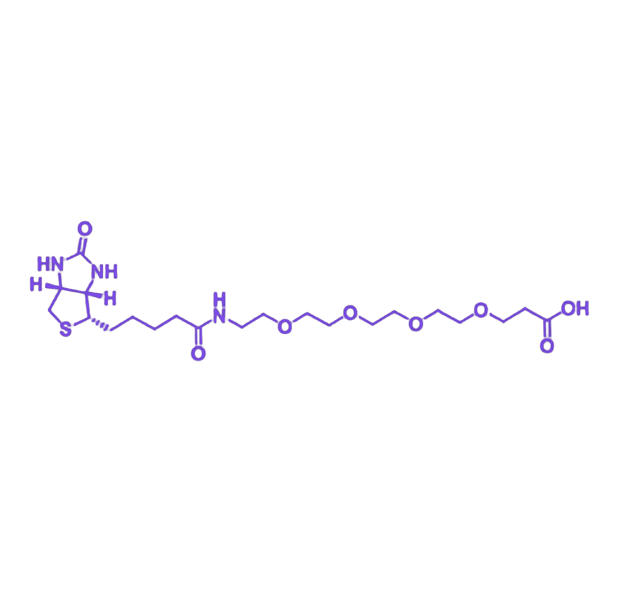 该化合物的核心功能单元包含三部分:生物素基团作为特异性识别模块,可与亲和素/链霉亲和素发生高效、专一的非共价相互作用(解离常数Kd≈10⁻¹⁵ M),为生物分子的靶向捕获与可视化检测提供分子基础;四聚乙二醇链段作为柔性连接桥,凭借其优异的水溶性、生物相容性及空间位阻效应,能有效降低修饰后复合物的免疫原性与非特异性吸附,提升分子在生理环境中的稳定性;末端羧基则作为化学反应活性位点,可在活化剂(如EDC/NHS)介导下与伯胺(-NH₂)、羟基(-OH)等官能团发生酰胺化或酯化反应,实现对抗体、多肽、药物分子及纳米材料的精准偶联。