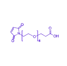 Mal-PEG6-COOH(马来酰亚胺-聚乙二醇-羧基)是一种由马来酰亚胺端基、六聚乙二醇链段和羧基组成的双功能化PEG衍生物,具备双端反应性与生物相容性,广泛应用于生物分子偶联与材料表面修饰。 其六聚乙二醇链段(PEG6)赋予分子良好的水溶性与稳定性,可有效降低蛋白质或材料表面的非特异性吸附;同时,适中的链段长度(约6个乙二醇单元)兼顾空间柔性与位阻调控,为生物偶联提供优化的空间环境。 马来酰亚胺基团能与巯基(-SH)发生特异性反应,形成稳定硫醚键,适用于半胱氨酸残基蛋白质、多肽或纳米材料的定点偶联;羧基端可通过EDC/NHS活化后与氨基(-NH2)缩合,形成稳定酰胺键,实现生物分子的多功能修饰。 作为交联桥梁分子,Mal-PEG6-COOH在抗体-药物偶联物(ADC)制备、纳米药物载体构建、生物探针开发及诊断试剂研发等领域发挥关键作用,为生物医学工程提供高效、稳定的分子偶联解决方案。
