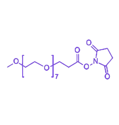 分子结构由三部分构成:一端为化学惰性的甲氧基(-OCH₃),可在储存及反应过程中稳定分子结构,有效抑制副反应发生;中间段由7个乙二醇单元组成的PEG链,赋予分子良好的亲水性,使其可在水、DMSO、DMF等极性有机溶剂中均匀分散并完全溶解;另一端为高反应活性的琥珀酰亚胺丙酸酯(SPA)基团,作为生物偶联反应的功能核心,可特异性结合生物大分子表面的氨基。