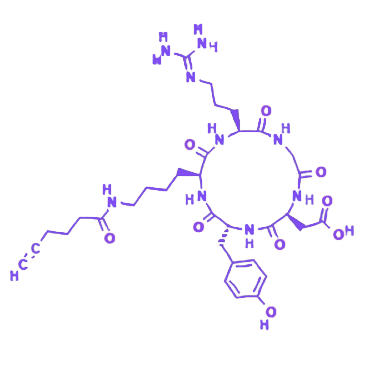 NHS-PEG-cRGD 是一种在生物医学与材料科学领域具有重要应用价值的多功能试剂,其分子结构由 NHS 酯基团、聚乙二醇(PEG)链段和 环肽 cRGD 三部分构成,通过协同作用实现生物分子修饰、靶向递送及生物相容性提升等核心功能。 分子一端的 NHS 酯具备高化学活性,在 pH 7-8.5 的弱碱性缓冲环境中,可与生物分子(如蛋白质、多肽、小分子胺等)的伯胺基团(-NH₂)发生快速共价反应,形成稳定的酰胺键,为生物分子的精准修饰与高效连接提供关键化学基础。 中间的 PEG 链段赋予试剂优异的水溶性和生物相容性,不仅显著提升化合物在水溶液中的分散能力,确保其在生物体系内的均匀分布与高效运输,还能有效降低分子的免疫原性,减少被免疫系统识别和清除的概率,从而增强修饰后分子的体内稳定性与循环时间。 分子另一端的 环肽 cRGD 由精氨酸(R)、甘氨酸(G)、天冬氨酸(D)组成环状结构,可特异性识别并结合细胞膜表面高表达的 整合素受体(如 αvβ3、α5β1),这类受体在肿瘤血管内皮细胞、成骨细胞及多种病变相关细胞表面富集,使该试剂成为肿瘤靶向治疗、药物递送系统构建、生物成像及组织工程支架研发等领域的关键工具。