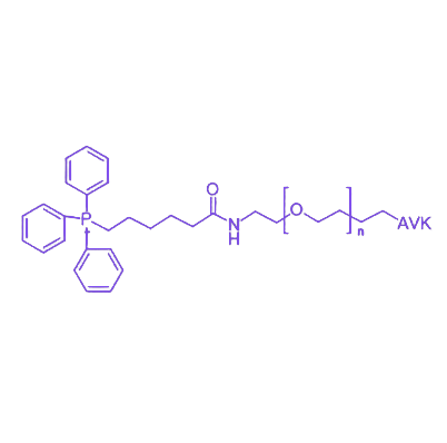 TPP-PEG-AVK是一种通过聚乙二醇(PEG)链共价连接三苯基膦(TPP)与AVK肽段的功能性生物偶联分子,兼具线粒体靶向性与生物活性肽的双重功能特性。该分子设计为生物医学研究提供了高效的活性位点递送工具,特别适用于靶向给药系统与细胞功能调控研究领域。 该化合物分子结构由三个关键功能单元构成:作为线粒体靶向基团的三苯基膦(TPP)通过静电相互作用特异性结合线粒体内膜;亲水性聚乙二醇(PEG)链提供良好的水溶性与生物相容性,有效降低免疫原性并延长血液循环半衰期;C端AVK肽段则通过特定生物分子相互作用介导靶向识别或细胞内信号调控。其典型分子量范围为1000-10000 Da,在水相缓冲液中呈现良好分散性,可通过核磁共振氢谱(¹H NMR)与高效液相色谱(HPLC)进行结构确证与纯度分析(纯度通常≥95%)。在应用层面,该偶联物可通过TPP基团的线粒体定位特性,将AVK肽段精准递送至线粒体内腔或膜间隙,实现对线粒体功能相关通路的调控,在神经退行性疾病模型构建、肿瘤细胞代谢干预等前沿研究中展现潜在应用价值。