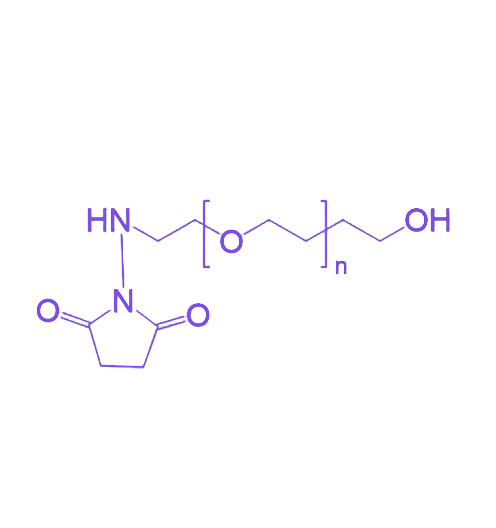 NHS-PEG-OH(活性酯-聚乙二醇-羟基)是一类具有双功能基团的线性聚合物材料,其分子结构中同时包含反应性活性酯基团与亲水性羟基末端,可作为连接子广泛应用于生物偶联、药物递送系统构建及纳米材料表面修饰等领域。该产品通过精确控制的化学合成工艺制备,兼具PEG链段的生物相容性与活性酯基团的高效反应特性。 该化合物的分子结构由聚乙二醇(PEG)主链、一端的N-羟基琥珀酰亚胺(NHS)活性酯基团及另一端的羟基(-OH)组成,其中PEG链段的分子量可根据应用需求进行定制调控。其物化性质表现为良好的水溶性与生物相容性,在水溶液中呈现稳定的分散状态,活性酯基团可在温和条件下与含氨基的生物分子(如蛋白质、多肽)发生高效共价偶联反应,形成稳定的酰胺键连接。这种独特的双功能设计使其在药物载体表面功能化、生物分子修饰及生物医用材料表面改性中具有重要应用价值,能够有效提升目标分子的水溶性、稳定性及生物靶向性,为生物医学研究及药物开发提供关键的材料支撑。