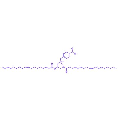 功能与应用特性表现为:通过疏水性尾部的自组装作用形成脂质体结构,同时利用阳离子头部的电荷效应实现生物分子的高效负载;油酰氧基链的不饱和双键结构可调节脂质体膜的流动性,优化递送系统与细胞膜的融合效率;羧基苄基的引入则为材料提供了潜在的功能化修饰位点,可进一步拓展其在靶向递送、 stimuli-responsive释放等领域的应用场景。该材料在基因治疗、疫苗递送及抗肿瘤药物载体研究中展现出良好的生物相容性与递送效率,是构建新型纳米药物递送系统的关键基础材料。