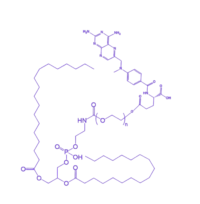 DSPE-PEG-MTX(二硬脂酰磷脂酰乙酰胺-聚乙二醇-甲氨蝶呤)是一种通过化学偶联技术构建的多功能纳米药物递送系统,整合了磷脂、聚乙二醇和化疗药物的核心特性,在靶向给药领域具有重要的应用潜力。 该化合物由三部分构成:疏水端为二硬脂酰磷脂酰乙酰胺(DSPE),可自组装形成稳定的脂质双分子层结构;中间连接臂为亲水性聚乙二醇(PEG)链段,能有效提高纳米粒子的水溶性和循环稳定性;末端偶联甲氨蝶呤(MTX),作为经典抗代谢药物发挥抗肿瘤活性。其分子结构赋予该材料良好的两亲性,可通过自组装形成粒径均一的纳米载药系统,实现药物的高效包载与控释。PEG化修饰显著降低了网状内皮系统的识别与清除,延长了体内循环时间,而MTX的靶向特性则有助于提升药物在病变部位的富集,减少对正常组织的毒副作用。该材料在肿瘤化疗、炎症性疾病治疗等领域展现出优异的应用前景,为研发新型靶向递药系统提供了关键的分子设计基础。