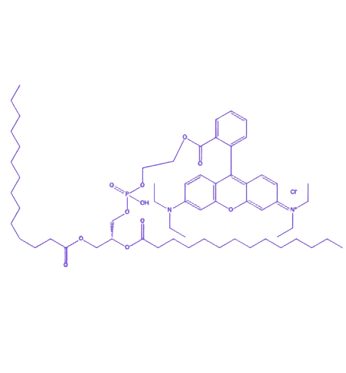 DMPE-RB(全称二肉豆蔻酰磷脂酰乙醇胺改性罗丹明B,1,2-dimyristoyl-sn-glycero-3-phosphoethanolamine-Rhodamine B)是一种由磷脂类化合物与荧光染料结合形成的功能性探针,其分子结构包含DMPE(二肉豆蔻酰磷脂酰乙醇胺)和罗丹明B两部分。该化合物兼具脂质载体的生物相容性与荧光标记的可视化特性,在生物医学研究领域具有重要应用价值。 DMPE作为分子骨架,属于双饱和脂肪酸链(肉豆蔻酸)磷脂,其两亲性结构使其适合用于构建脂质体或其他脂质递送系统,能够模拟生物膜结构并提高生物相容性。罗丹明B作为荧光发色团,具有鲜桃红色外观,易溶于水、乙醇等极性溶剂,微溶于丙酮、氯仿等有机溶剂,在特定波长激发光照射下可发出强烈且稳定的荧光信号。这种荧光特性赋予DMPE-RB优异的光学追踪能力,信号持久度满足长时间细胞成像需求,可实现动态生物学过程的实时监测。 DMPE-RB的设计整合了磷脂的生物膜亲和力与罗丹明B的荧光示踪功能,适用于脂质体载药系统的定位追踪、细胞内吞途径研究及生物分子相互作用可视化分析。其荧光稳定性和化学兼容性使其成为细胞生物学、药物递送及分子影像学研究中的理想工具。