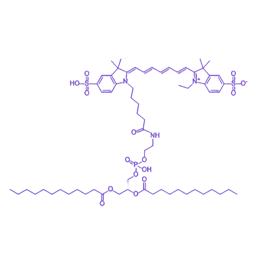 DLPE-CY7是由二月桂酰磷脂酰乙醇胺(DLPE)与近红外荧光染料CY7偶联形成的功能性生物探针,融合了DLPE的生物相容性与CY7的光学成像优势,在生物医学研究中可作为高效示踪工具。 DLPE分子具有典型的两亲性结构:亲水头部由磷酸乙醇胺构成,疏水尾部为两条月桂酸烃链,这种结构使其在水溶液中可自组装形成与生物膜结构相似的脂质双分子层,因此常被用作脂质体、纳米颗粒等药物递送载体的基础材料,具备良好的生物相容性。 CY7作为近红外荧光染料,其吸收与发射光谱集中在750-800nm区间,该波段处于生物组织的“光学窗口”,具有光穿透性强、背景荧光干扰低的特点。同时,CY7分子具有高荧光量子产率和优异的光稳定性,可产生持久且稳定的荧光信号,且对生物样本的非特异性吸附较弱,保障了成像结果的准确性。 DLPE-CY7通过将DLPE的载体特性与CY7的荧光成像能力结合,可广泛应用于生物医学研究场景:既能标记细胞膜或脂质体,实时追踪细胞内吞、囊泡运输等动态生命活动;也可作为荧光示踪剂用于活体动物成像,监测药物载体在体内的分布、代谢及靶向效率,为疾病诊断、药物研发及生物过程机制研究提供关键技术支持。