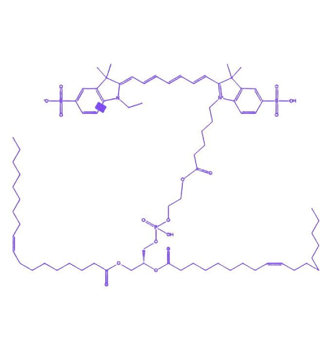 DOPE-CY7是由磷脂酰乙醇胺(DOPE)与近红外荧光染料CY7通过共价键连接形成的共轭化合物,兼具磷脂的生物膜亲和特性与近红外荧光成像功能,适用于生物医学研究中的荧光标记与高分辨率成像应用。 化学组成与结构特征:该化合物由两部分构成,磷脂部分(DOPE)作为膜靶向载体,具有良好的生物相容性和膜融合能力,可稳定嵌入自然或合成膜结构的双层膜中;荧光部分(CY7)作为信号报告基团,通过共轭作用与DOPE形成功能一体化分子结构,确保荧光信号的高效传递与稳定性。 荧光性能参数:CY7组分赋予DOPE-CY7优异的近红外荧光特性,其发射波长位于近红外光谱区域,可有效降低生物样本的自发荧光干扰与组织散射吸收,实现深层组织穿透成像;同时具备较高的荧光量子产率,在低浓度条件下即可产生强荧光信号,显著提升成像灵敏度与空间分辨率。 生物应用特性:依托DOPE的膜融合性与CY7的光学优势,该共轭体可作为理想的荧光探针,用于活细胞动态追踪、亚细胞结构定位及复杂生物样本的原位成像分析,为膜生物学研究、药物递送监测及疾病诊断提供可视化技术支持。