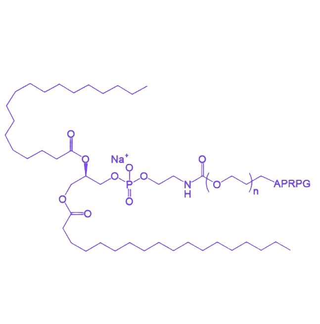DSPE-PEG-APRPG是一种由二硬脂酰基磷脂酰乙醇胺(DSPE)、聚乙二醇(PEG)与靶向肽APRPG共价偶联形成的功能性生物分子探针,其设计整合了磷脂的膜亲和特性、PEG的亲水性修饰功能以及APRPG肽段的靶向识别能力,在生物医学研究领域具有潜在的应用价值。 该分子的核心结构单元包括:作为脂溶性锚定部分的DSPE,其两条长链脂肪酸链赋予分子良好的细胞膜融合能力,可促进载体系统与生物膜的相互作用;作为亲水性间隔臂的PEG聚合物,通过增加分子的水溶性和生物相容性,有效减少非特异性蛋白吸附并延长其在生物体内的循环半衰期;以及作为靶向配体的APRPG五肽(氨基酸序列:Ala-Pro-Arg-Pro-Gly),其特有的氨基酸组成使其能够与特定生物靶点发生特异性相互作用,为药物递送或分子成像提供精准导向功能。 各组分通过化学偶联形成稳定的三嵌段结构,其中PEG链的引入不仅解决了磷脂分子在水性体系中的分散难题,还通过空间位阻效应降低了网状内皮系统的清除效率;APRPG肽段则通过末端官能团与PEG链共价连接,确保靶向活性的高效保留。这种多功能整合设计使DSPE-PEG-APRPG在构建主动靶向型纳米递送系统、细胞成像探针等方面展现出独特的技术优势,为疾病诊断与治疗研究提供了新型工具。