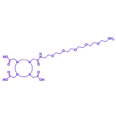 DOTA-PEG5-NH₂(1,4,7,10-四氮杂环十二烷-1,4,7,10-四羧酸-聚乙二醇5-氨基)是一类融合大环螯合剂DOTA、PEG5间隔臂与末端氨基三重功能的生物共轭工具,通过模块化设计实现金属离子螯合、亲水性调节与生物分子偶联的协同作用。其分子结构中,DOTA环提供对稀土金属及放射性核素的高亲和力配位位点,PEG5链段赋予化合物优异的水溶性与构象柔性,末端伯氨基则可通过酰胺键、席夫碱等反应实现与蛋白、肽段或纳米载体的定向偶联。