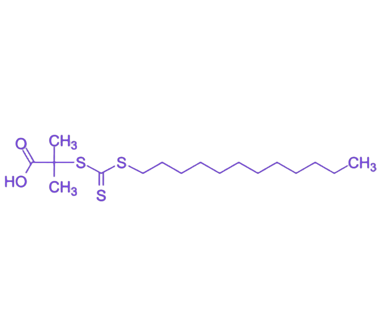2-(十二烷基硫代羰基硫代)-2-甲基丙酸(简称DDMAT)是RAFT聚合领域标志性链转移剂,尤其作为甲基丙烯酸酯类单体可控聚合的"黄金标准"试剂,其分子结构经精心设计,在聚合控制性与产物功能性间实现平衡,可靠性和普适性历经近二十年验证,是精密高分子合成的基础性关键材料。 分子结构包含三大功能单元:α-甲基丙酸结构末端的羧基提供直接高效的后续功能化位点,核心三硫代碳酸酯活性中心精准调控链增长过程,长链十二烷基赋予良好有机溶解性和适度疏水性。这种结构设计使试剂在有机相溶解、疏水嵌段形成及水分散性、可修饰性方面表现优异。 聚合性能上,凭借Z基团(十二烷基)与R基团(带羧基的氰基异丙基类似结构)的完美匹配,对甲基丙烯酸酯类单体展现出卓越控制能力,能有效抑制MMA聚合自加速效应,可轻松获得分子量分布指数(PDI)低于1.1的聚合物,是合成结构明确嵌段共聚物(如PMMA-b-PnBA)的首选试剂。 聚合物末端羧基作为强大化学手柄,可通过碳二亚胺(如EDC)等偶联剂与胺基反应,实现与荧光染料、靶向配体、生物大分子的共价连接,显著拓展材料在生物医学领域的应用。基于DDMAT合成的聚合物已广泛应用于药物递送纳米载体、生物传感器涂层、高性能涂料和粘合剂,以及纳米复合材料设计等领域。