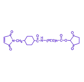 SMCC-PEG4-NHS是一种具有双功能活性的交联剂,其分子结构包含NHS酯活性端与马来酰亚胺端(–MAL),通过PEG4柔性链实现双端连接。该设计可通过分步化学反应实现目标分子的定向偶联,NHS酯端能与蛋白质、抗体或多肽的自由胺基(–NH₂)发生酰胺化反应,马来酰亚胺端则选择性与半胱氨酸残基的巯基(–SH)进行迈克尔加成反应,从而构建稳定的双端偶联产物。