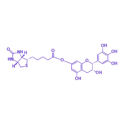 biotin-EGC 是通过化学方法将生物素与表没食子儿茶素(EGC)共价连接形成的功能性化合物,该分子设计整合了生物素的特异性亲和特性与表没食子儿茶素的天然生物活性,在生物医学研究及相关领域具有潜在应用价值。 生物素作为水溶性维生素(又称维生素 H 或辅酶 R),在生物体内主要以羧化酶辅酶形式参与脂肪酸合成、葡萄糖异生及氨基酸代谢等关键生理过程。其分子结构中的脲基环可与亲和素/链霉亲和素产生纳摩尔级别的特异性结合,这一特性使其广泛应用于生物分子标记、免疫检测及蛋白分离纯化等实验技术。 表没食子儿茶素(EGC)是绿茶茶多酚的主要活性成分之一,属于儿茶素类多酚化合物。其分子结构中的多个酚羟基赋予其强抗氧化能力,可通过清除自由基、抑制脂质过氧化等机制减少氧化应激损伤,相关研究表明其在抗炎、细胞保护及代谢调节等方面具有多重生物效应。 biotin-EGC 的合成通过生物素的羧基与 EGC 的羟基形成稳定酯键,既保留了生物素的配体结合活性,又维持了 EGC 的酚羟基反应性,为构建靶向递送系统或多功能检测探针提供了结构基础。