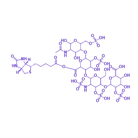 该化合物的核心结构由 达肝素 母体与 生物素 修饰基团构成,其中达肝素作为低分子肝素,主要通过抑制凝血因子 Xa 活性发挥抗凝作用;生物素部分则赋予其与固相载体固定的亲和素或链霉亲和素特异性结合的能力,可实现达肝素在生物体内的定向输送,进而精准调控其组织分布与生物学效应。