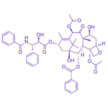 紫衫醇是一种具有明确化学结构的化合物,其分子式为C47H51NO14,相对分子质量为853.91。该物质呈现为白色结晶性粉末状,无臭且无味,在溶剂溶解性方面表现出显著的亲有机相特性,难溶于水,而易溶于甲醇、乙腈、氯仿、丙酮等有机溶剂,目前临床应用的制剂主要采用聚氧乙烯蓖麻油(Cremophore EL)-无水乙醇溶液作为溶剂体系。 值得注意的是,紫杉醇在溶液状态下存在与玻璃或塑料表面发生非特异性结合的特性,这种相互作用可能导致其实际浓度降低,在制剂储存和使用过程中需加以关注。