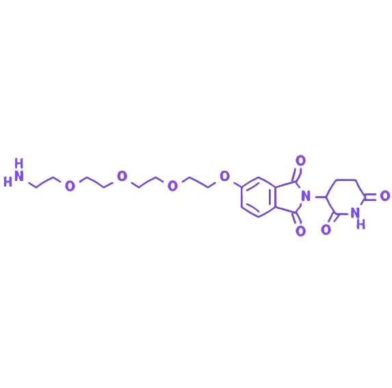 Thalidomide-5-PEG4-NH2 是沙利度胺的功能性衍生物,通过在五位引入四单元聚乙二醇(PEG4)链段并末端修饰氨基(-NH2),实现了药效骨架、亲水性与化学修饰位点的协同优化,为生物材料功能化及分子探针构建提供关键工具。其设计核心在于利用PEG4链的柔性亲水特性改善母体分子的水相溶解分散性能,同时通过末端氨基的化学反应活性拓展多样化偶联应用,尤其适用于需要精准调控空间构象与界面相互作用的生物医学研究场景。 该分子以沙利度胺为结构母体,通过C5位定点修饰引入PEG4连接臂,形成兼具刚性药效骨架与柔性间隔链的复合结构。PEG4片段(-O-(CH2CH2O)3-CH2CH2-)的引入可显著降低分子疏水聚集倾向,提升水相体系中的分散稳定性,减少非特异性蛋白吸附;末端伯氨基(-NH2)则可与NHS酯、羧酸、马来酰亚胺等多种官能团发生酰胺化、酰肼化或迈克尔加成等高效偶联反应,为功能分子的定向修饰提供化学兼容位点。 在应用层面,该衍生物可作为模块化构建单元,广泛用于纳米载体表面功能化改性、荧光/放射性分子探针制备、药物递送系统的靶向配体偶联,以及抗体-药物偶联物(ADC)的连接子优化。PEG4链的16原子长度(约1.9 nm伸展构象)可有效调控偶联组分间的空间距离,避免 steric hindrance 对生物活性的影响,同时增强修饰后复合物的血液循环半衰期。 产品通常以HPLC纯度≥98% 的白色粉末形式提供,储存需满足避光、干燥条件(建议-20℃惰性气体保护)。使用前应在无水DMSO或DMF中制备储备液(浓度推荐5-10 mM),避免水溶液中氨基的质子化或氧化失活。长期储存的溶液需经0.22 μm滤膜除菌后,分装于棕色安培瓶中,在-80℃条件下避光保存,以最大化保持化学稳定性。