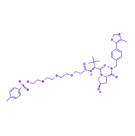 (S, R, S)-AHPC-PEG4-tosyl 是一种基于VHL蛋白配体的PROTAC连接子,由(S, R, S)-AHPC手性配体、四聚乙二醇(PEG4)柔性链段及对甲苯磺酰基(Tos)功能基团组成,主要用于合成靶向蛋白降解剂(PROTAC),为PROTAC设计提供灵活化学空间,尤其适用于需要优化连接子长度和化学稳定性的研究场景。 该化合物的分子结构设计包含三个关键功能单元:(S, R, S)-AHPC作为VHL蛋白的特异性配体,可募集E3泛素连接酶;PEG4柔性链段通过增加分子亲水性提升其在水性介质中的溶解度,并降低非特异性结合;Tos基团作为优良离去基团,能通过亲核取代反应参与多种偶联反应,实现与靶蛋白配体的高效连接。 在作用机制上,(S, R, S)-AHPC-PEG4-tosyl 合成的PROTAC化合物可介导E3连接酶(如VHL)与靶蛋白的特异性结合,形成三元复合物,进而诱导靶蛋白泛素化修饰并通过蛋白酶体途径降解。该产品在靶向蛋白降解研究中具有重要应用价值,可助力开发高效、高选择性的蛋白降解工具。