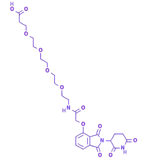该化合物的分子结构特点在于 PEG4 链长度适中,为偶联分子间提供充足空间距离,同时增强水溶性,有助于优化分子在生物体系中的分布与稳定性。在 PROTAC 研发中,其常作为 E3 泛素连接酶配体(如 cereblon 配体)的修饰端,通过末端羧酸与靶标配体偶联形成双功能分子,PEG4 链的柔性和亲水性可促进三元复合物形成,提升靶蛋白降解效率。