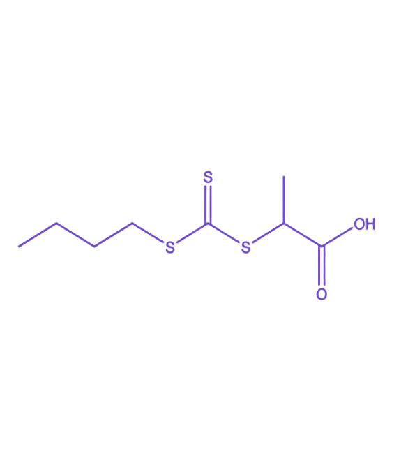 2-(Butylthiocarbonothioylthio)propanoic acid 是一种含羧酸官能团与硫代碳酰硫基团的 RAFT 链转移剂核心构件,具有自由基链转移能力,是可控/活性自由基聚合(CRP)中实现精确定制聚合物结构的关键试剂。其分子设计兼具聚合调节功能与后续修饰潜力,广泛适用于丙烯酸类、甲基丙烯酸类、苯乙烯类及含电子吸拉基团单体的聚合反应,为功能性材料制备提供高效解决方案。