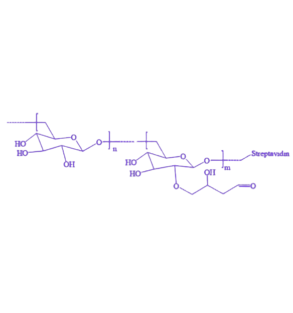 该结合物的核心特性体现在双组分协同作用:葡聚糖作为天然多糖骨架,赋予分子良好的流体动力学性质与表面可修饰性,其分子量与连接比例的调控可实现对结合物分子大小及表面电荷的精准定制;链霉亲和素组分则完整保留对生物素的特异性识别能力,确保与生物素化探针的高效结合。这种结构设计使Dextran-SA在水溶液中维持稳定构象,可通过葡聚糖链的化学衍生引入靶向配体或信号标记基团,满足多场景应用需求。