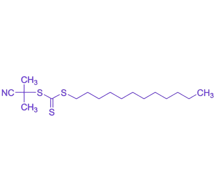 分子结构层面,该试剂一端为氰基异丙基基团,通过强吸电子效应稳定增长链自由基,保障聚合过程的“活性”特征;中间以三硫代碳酸酯作为可逆链转移的核心活性中心;另一端引入十二烷基长链,不仅提升有机相容性与疏水性,还通过空间位阻效应优化链转移效率。这种平衡设计赋予试剂适中的链转移常数与化学通用性,成为RAFT试剂分子设计的典范结构。