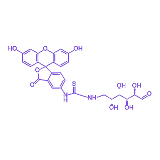 FITC-Galactose是由异硫氰酸荧光素(FITC)与半乳糖通过化学偶联形成的荧光标记化合物,兼具半乳糖的生物学靶向特性与FITC的荧光示踪功能,是生物医学研究中可视化分析的重要工具。 FITC作为常用荧光染料,呈黄色至橙黄色结晶粉末状,易溶于水及酒精溶剂,具有490-495nm的最大吸收波长和520-530nm的最大发射波长,可产生明亮的黄绿色荧光,且具备良好的光稳定性与较高的荧光量子产率。半乳糖为分子式C₆H₁₂O₆的单糖,属于醛糖和己糖,由六个碳和一个醛基组成,广泛存在于奶类产品及甜菜中,是构成糖蛋白的关键成分,也是哺乳动物乳汁中乳糖的组成单元。 该化合物通过化学修饰实现FITC与半乳糖的稳定连接,既保留半乳糖对特定受体的亲和能力,又赋予其荧光检测特性。在生物医学研究中,可利用荧光显微镜、流式细胞仪等设备,基于其荧光信号追踪半乳糖在细胞内的代谢路径与转运过程,分析细胞间基于半乳糖的相互作用,同时可用于识别和定位半乳糖受体高表达的细胞群体,为生物过程的动态监测与机制研究提供直观的可视化手段。