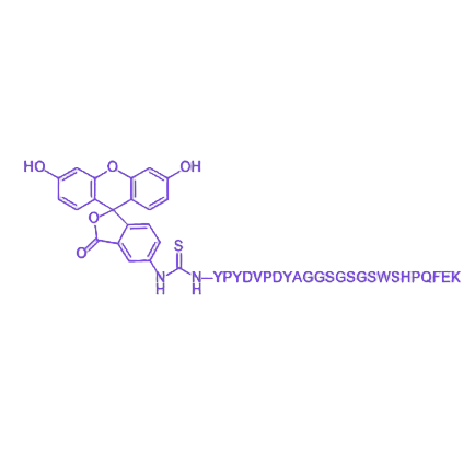 FITC-YPYDVPDYAGGSGSGSWSHPQFEK 是一种**荧光标记多肽**,通过化学合成技术制备,核心结构包含特定氨基酸序列,C端经高效化学偶联反应共价连接**荧光素异硫氰酸酯(FITC)** 基团。该产品融合HA标签(YPYDVPDYA)与Fc片段衍生序列(SWSHPQFEK)的功能特性,兼具抗原表位识别能力与免疫球蛋白/细胞表面受体特异性结合能力,可作为可视化工具广泛应用于免疫学、细胞生物学及药物研发领域。