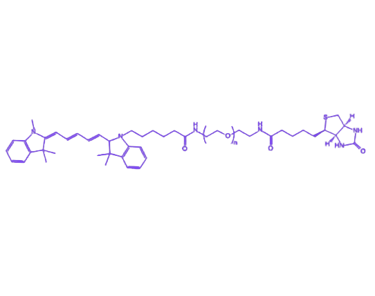 Cy5-PEG-Biotin是一种整合荧光标记、亲水性调节及生物靶向功能的多功能高分子衍生物,通过化学偶联实现Cy5、PEG与Biotin的稳定结合,在生物成像、免疫分析及药物递送等领域展现出显著应用潜力。 其核心组件花青5(Cy5)作为近红外荧光染料,具备高荧光量子产率和强组织穿透能力(激发波长约649nm,发射波长约670nm),可有效降低背景荧光干扰,适用于深层组织的精准荧光示踪。聚乙二醇(PEG)链段赋予产品优异的亲水性与生物相容性,通过空间位阻效应减少非特异性吸附,延长体内循环时间并降低免疫原性。生物素(Biotin)则凭借与链霉亲和素(Streptavidin)的特异性高亲和力结合特性,实现靶向识别与生物分子高效偶联。三者协同作用使该衍生物同时具备荧光示踪、水溶性改善及生物靶向功能,为生物医学研究提供多维度技术支持。