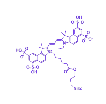 Cy3.5-NH2是一种整合了Cy3.5荧光染料与氨基基团的功能性化合物,其核心价值在于通过化学偶联实现生物分子的荧光标记与示踪。该产品借助Cy3.5染料的近红外荧光特性与氨基的化学反应活性,为生命科学研究中的分子检测提供可靠工具。 Cy3.5荧光基团作为花青素类染料的典型代表,具有近红外区域的发射光谱特性,这一波段的荧光信号可有效降低生物样品自发荧光干扰,提升检测信噪比。其优异的光学稳定性与量子产率,确保标记后分子在长时间观察或复杂实验条件下仍能保持稳定的信号输出。 氨基官能团(-NH2)赋予分子关键的化学偶联能力,可与生物分子(如蛋白、核酸、多肽)表面的羧基(-COOH)、醛基(-CHO)等活性基团发生酰胺化、席夫碱反应等共价结合,形成稳定的酰胺键或亚胺键。这种特异性反应机制保证了标记过程的可控性与产物的结构稳定性,适用于抗体标记、核酸探针制备、细胞成像等多样化实验场景。 标记后的目标分子在特定激发光(通常对应Cy3.5的激发波长)作用下发射红色荧光,可通过荧光显微镜、流式细胞仪、荧光分光光度计等设备进行定性观察与定量分析,实现对生物分子在细胞内定位、动态相互作用及代谢过程的精准追踪。