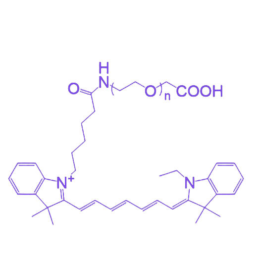 CY7-PEG-COOH 是一类整合近红外荧光特性、生物相容性修饰及共价偶联功能的多功能生物标记试剂,其分子结构由 菁染料 CY7、聚乙二醇(PEG)链段和 羧基(-COOH)活性基团三部分构成,适用于生物成像、药物递送等生物医学研究领域。 菁染料 CY7作为核心荧光单元,具有 高荧光量子产率与 优异光稳定性,其发射波长位于 750-800nm 近红外区域,此波段可有效降低生物样品自发荧光干扰,提升组织穿透深度,是生物成像应用中的关键特性。 聚乙二醇(PEG)链段赋予分子 良好生物相容性与 亲水性,同时通过空间位阻效应降低生物分子的免疫原性,延长偶联物在体内的循环时间,增强其生物应用中的稳定性与安全性。 末端 羧基(-COOH)为该试剂提供 高反应活性位点,可与含氨基、羟基等官能团的生物分子(如蛋白质、多肽、核酸)通过酰胺键、酯键等共价连接实现高效偶联。实际应用中,CY7 分子的反应性(如亲核/亲电取代)通常被规避,其核心价值主要体现在近红外光谱特性的利用,而羧基主导的偶联反应则是实现功能化修饰的主要途径。