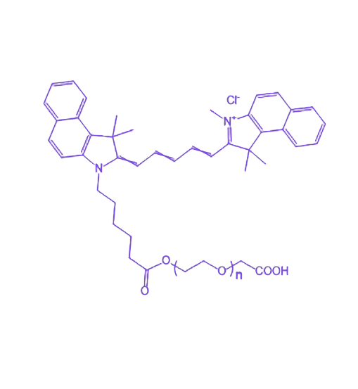 CY5.5-PEG-COOH是一种整合近红外荧光特性与生物相容性修饰功能的多功能生物标记与修饰试剂,广泛应用于生物医学领域的检测、成像及材料修饰等场景。 CY5.5作为近红外荧光染料,具有高荧光量子产率、良好的光稳定性及700-720nm波长发射特性,可有效规避生物组织自发荧光干扰,实现高灵敏度检测。PEG segment赋予分子优异的生物相容性、亲水性与柔性,能够显著降低修饰后分子的免疫原性及非特异性吸附。羧基(-COOH)则提供关键反应活性位点,可通过共价键与含氨基、羟基等基团的生物分子或材料偶联。 在化学反应层面,羧基在N,N'-二环己基碳二亚胺(DCC)、N-羟基琥珀酰亚胺(NHS)等缩合剂存在下,能与含氨基(-NH₂)的化合物(如蛋白质、多肽、氨基修饰纳米材料)发生酰胺化反应,形成稳定酰胺键完成荧光标记;同时也可与醇类发生酯化反应,拓展修饰应用场景。该试剂在细胞成像、化合物递送载体修饰、生物传感器制备等生物医学研究中展现出重要应用价值。