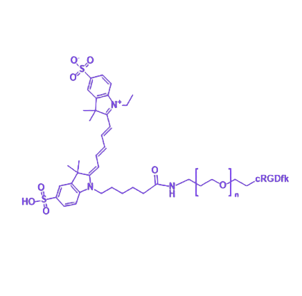 Cy5-PEG-cRGDfk是一种由Cy5近红外荧光染料聚乙二醇(PEG)cRGDfk环肽共价偶联形成的多功能靶向分子探针,兼具荧光成像功能、生物相容性修饰及主动靶向能力,适用于生物医学研究中的特异性成像与靶向递送应用。