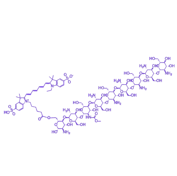 CY7-CS复合物通过将Cy7的荧光追踪功能与壳聚糖的生物载体特性有机结合,在生物医学研究中展现出多元化应用价值。在生物分子追踪领域,可利用Cy7的近红外荧光信号实时监测目标分子在生物体内的分布、迁移及代谢过程;在细胞成像与组织成像研究中,能够清晰呈现细胞内部结构特征及组织病理形态学变化;在药物递送系统构建中,借助壳聚糖的生物黏附性和靶向修饰潜力,可提高负载化合物的递送效率与靶向特异性,降低对正常组织的毒副作用。该复合物为疾病诊断、药物研发及生物治疗等领域提供了高性能的工具支持,具有重要的科学研究价值和临床转化潜力。