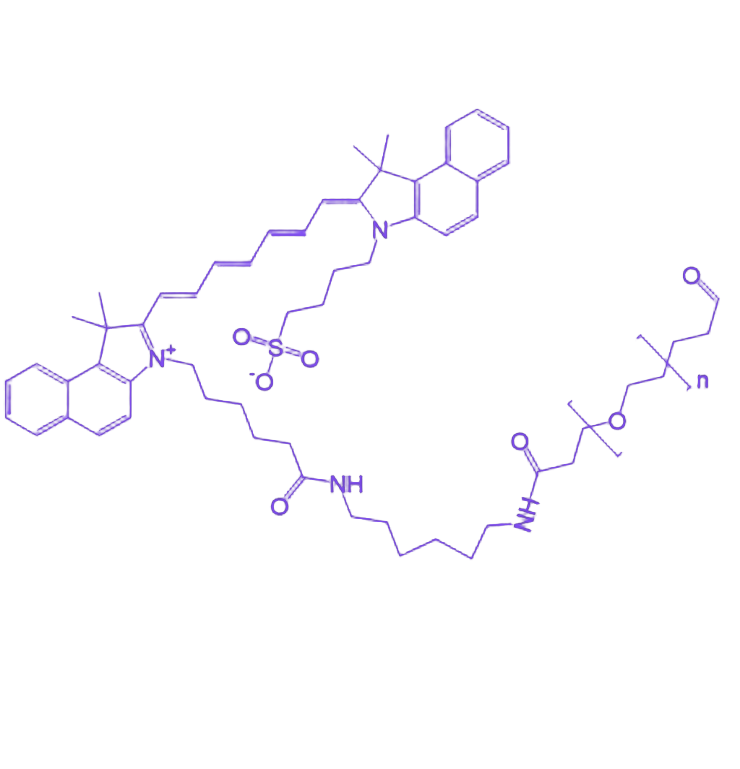 CHO-PEG-ICG是一种兼具化学修饰功能、生物相容性与近红外光学性能的多功能化合物,通过醛基官能团实现生物分子偶联,PEG链段提升水溶性与生物安全性,ICG组分赋予近红外荧光成像能力,在生物医学研究领域具有重要应用价值。 该化合物的醛基官能团可与含氨基等活性基团的生物分子或材料发生特异性化学反应,为靶向分子修饰、生物材料交联提供高效偶联位点。聚乙二醇(PEG)链段赋予其优异的水溶性和生物相容性,能显著降低生物体内的免疫原性,并提升化合物在水溶液环境中的分散稳定性,为生物体系应用奠定基础。吲哚菁绿(ICG) 作为近红外荧光染料,在近红外光区具有强吸收与发射特性,可实现深层组织穿透与高信噪比成像,是生物成像的关键功能单元。 在生物医学研究中,CHO-PEG-ICG可通过醛基与抗体、肽段等靶向分子连接,构建特异性探针,用于细胞标记、肿瘤成像等场景。其近红外荧光特性能够穿透生物组织屏障,实现对特定细胞或病变组织的精准可视化,为疾病的早期诊断、病理机制研究提供重要工具。
